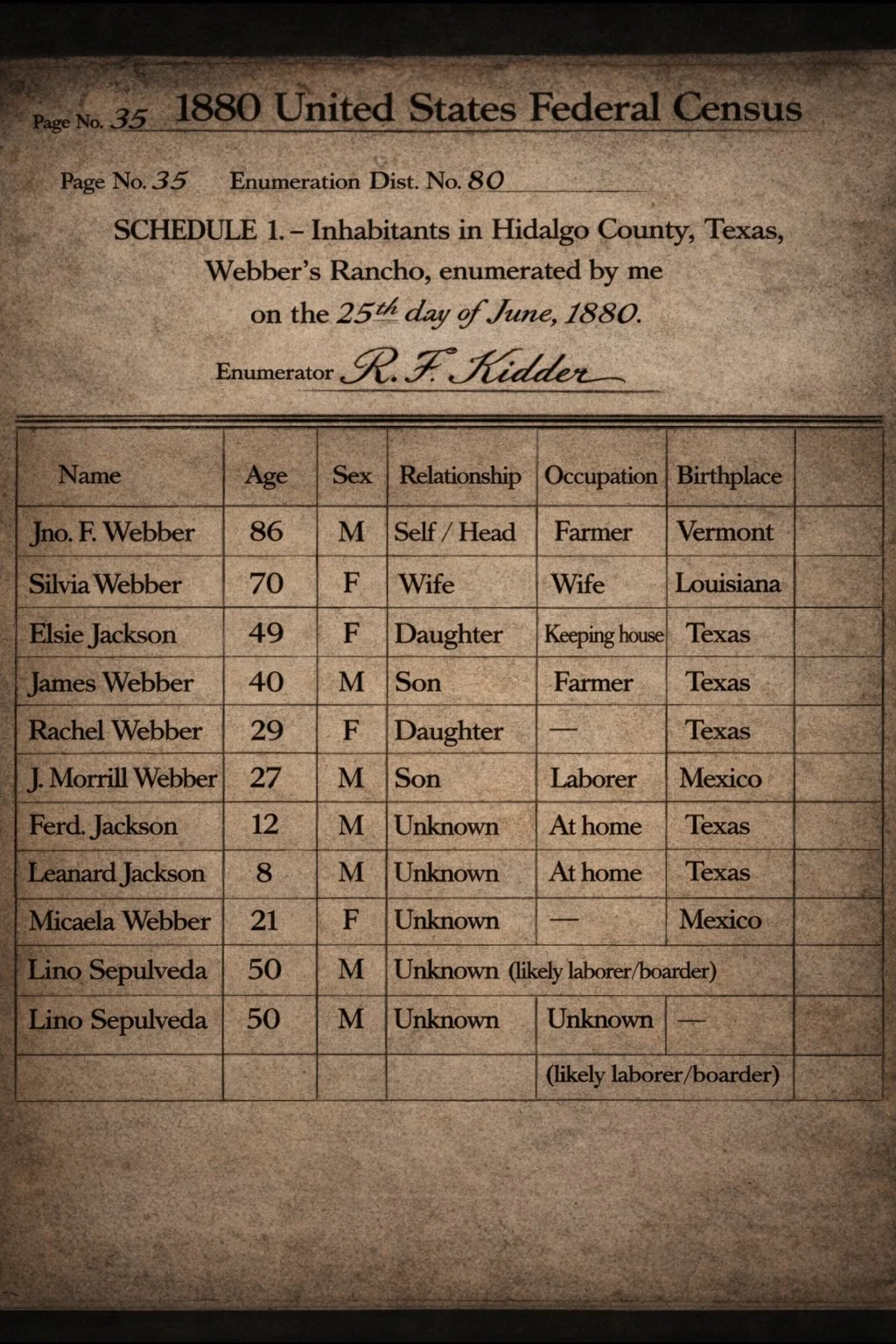 At its center stand John F. Webber, eighty years old, and Silvia Webber, seventy. For the first time in federal records, the relationship column names her plainly: