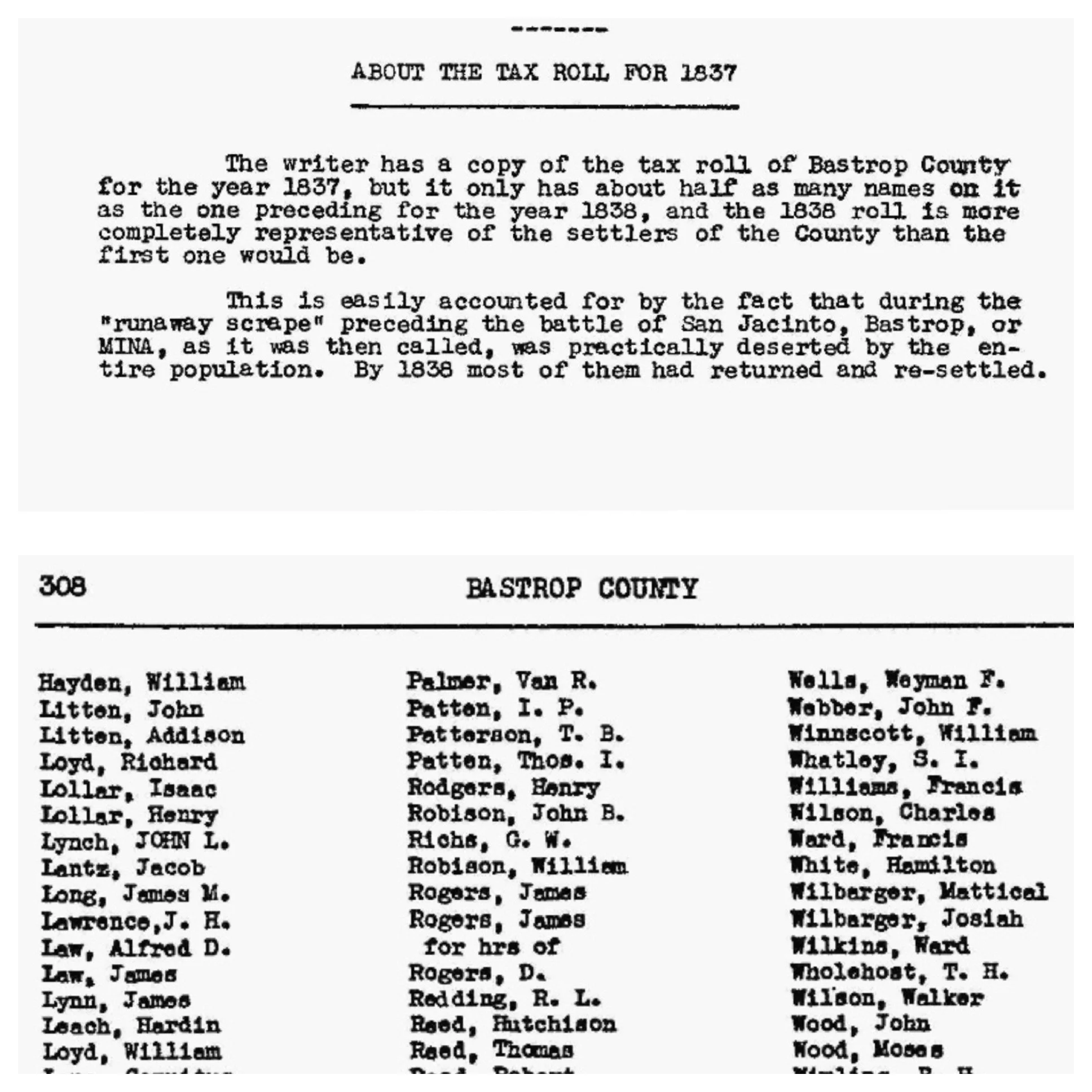 A page from a historical county tax record listing John F. Webber among early settlers. The preface explains that the 1837 population had temporarily fled during the “Runaway Scrape” and returned by 1838.