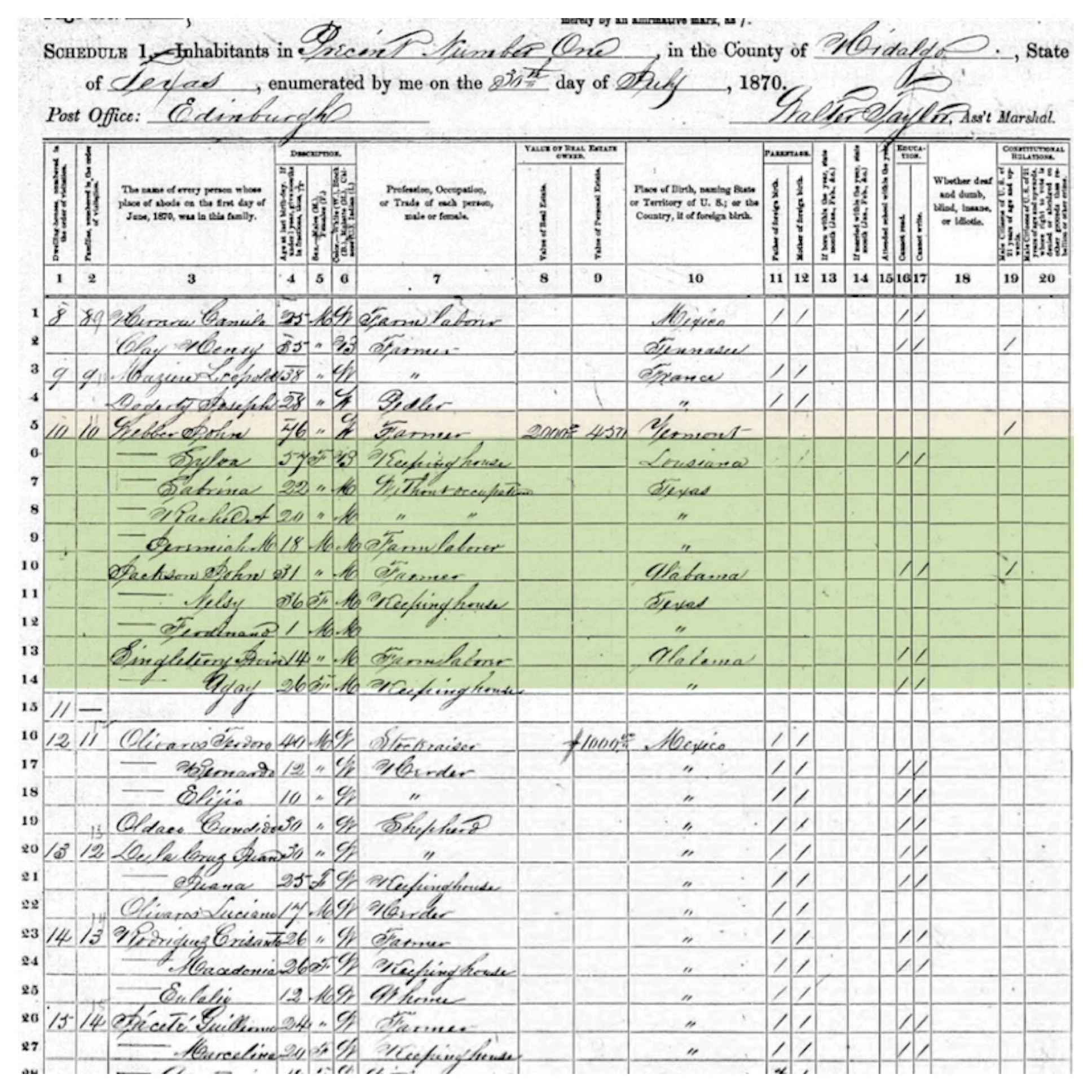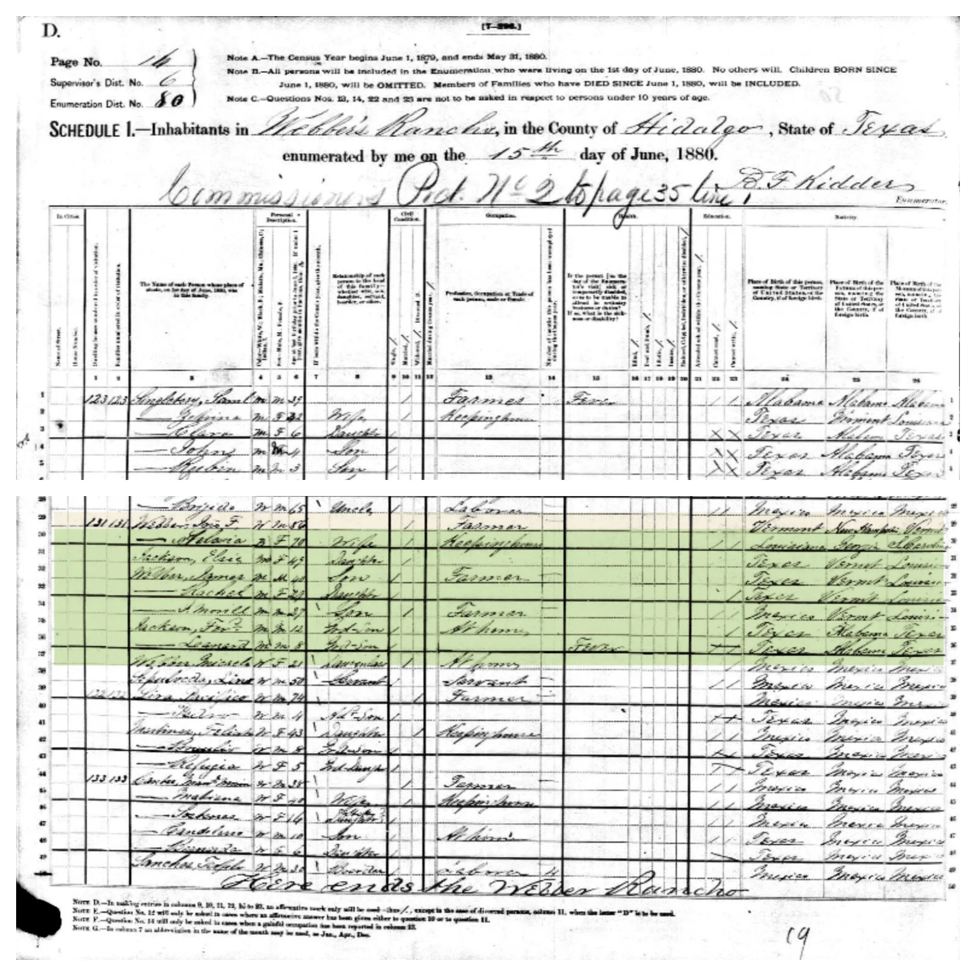 The 1870 Hidalgo County census highlights the Webber household in a predominantly Mexican and Tejano ranching community. Names, ages, occupations, and birthplaces document a multiracial extended family along the Rio Grande after the Civil War.