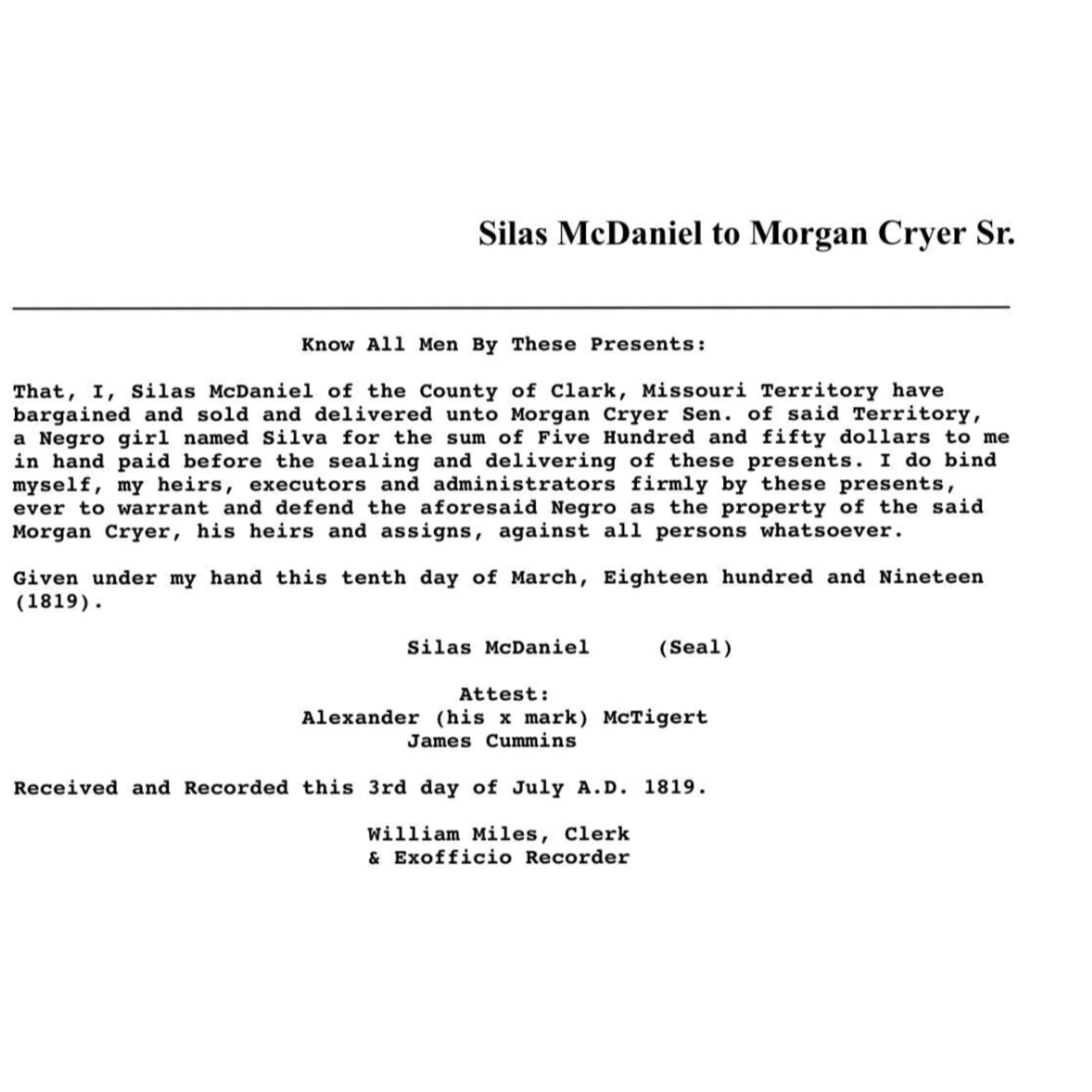 1819 Missouri Territory bill of sale transferring a girl named Silva.