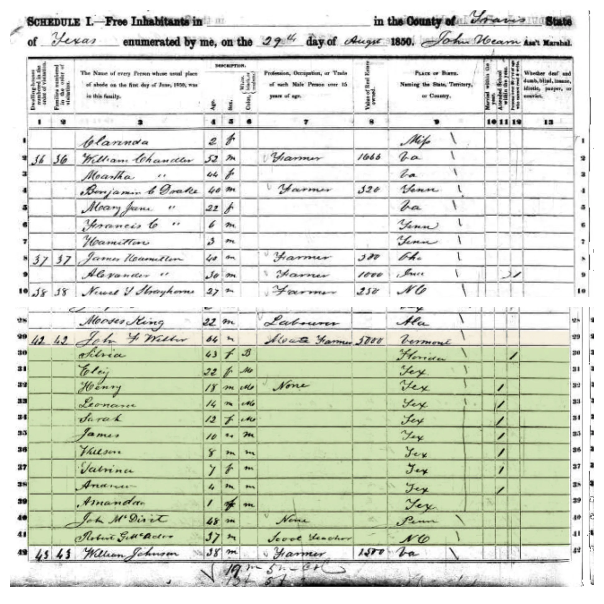 This page shows who remained on or near the former Webber ranch, how family members identified in terms of race and occupation, and how the community surrounding Silvia’s descendants evolved in the first years of Reconstruction.
